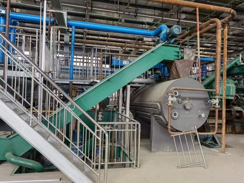 層蝶式汽提塔是國內(nèi)浸出油廠使用較多的一種汽提設(shè)備。若按照水蒸氣對混合油的汽提次數(shù),層蝶式汽提塔可分為單段式和雙段式兩種。雙段蝶式汽提塔,它主要有頂蓋、上塔體、中塔體、下塔體以及底蓋所組成。在上塔體和下塔體內(nèi)各有6-9組碟盤。每組碟盤都由滯流盤、錐形分配碟和環(huán)形分配碟組成。上、下塔體的外殼均裝有夾套,在夾套中通入343-441kPa的加熱蒸汽對塔內(nèi)的混合油進行間接加熱。中塔體和底盤內(nèi)各有一組直接蒸汽噴入裝置。這組裝置由集油盤、導(dǎo)流管、中心管、直接蒸汽噴管組成。來自第二蒸發(fā)器的混合油,進入層蝶式汽提塔的進油管之后,自上而下逐次流經(jīng)每一組碟盤。到達中塔體的集油盤底的阻攔,被汽提出的溶劑蒸汽和水蒸氣繞過集油盤向上移動,而油被阻留落下。之后,混合油又沿著下塔體內(nèi)的各組碟盤逐次流下,到達底蓋內(nèi),在直接蒸汽噴入裝置中又一次被汽提,汽提出的溶劑蒸汽和水蒸氣自下而上逐級通過每一組碟盤的空隙,與碟盤表面流下的液膜狀混合油充分接觸,使混合油得到進一步汽提。到達頂部的混合蒸汽通過出氣管進入汽提冷凝器。經(jīng)汽提后的浸出毛油從底部的出油管通過液封裝置排出。層蝶式汽提塔結(jié)構(gòu)較為簡單,操作方便,工藝效果好。但是必須注意的:每一組碟盤的制造質(zhì)量和是否水平安裝,將影響混合油液膜的形成與氣液相接觸的面積;直接蒸汽含水,會造成毛油中磷脂的析出;直接蒸汽壓力過高或者用量過大,會形成液泛現(xiàn)象;混合油中含雜太多,則使汽提塔碟盤表面的結(jié)垢現(xiàn)象嚴(yán)重,毛油質(zhì)量降低;若采用多段式,應(yīng)使上層直接蒸汽壓力低于下層。直接蒸汽好采用低壓過熱蒸汽。層蝶式汽提塔在檢修時碟盤的清理比較麻煩。